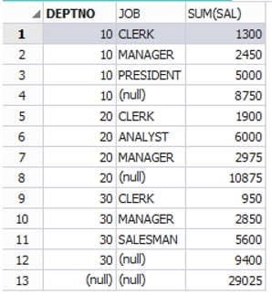 SELECT deptno,TO_CHAR(NULL) AS job, SUM(sal)