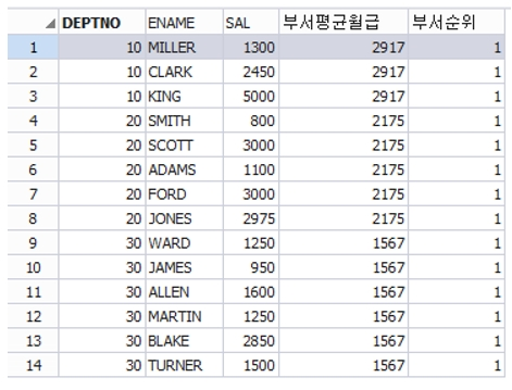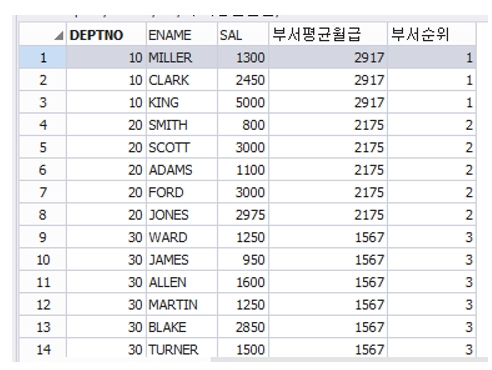 dense_rank()over(order by 부서평균월급 desc) 부서순위