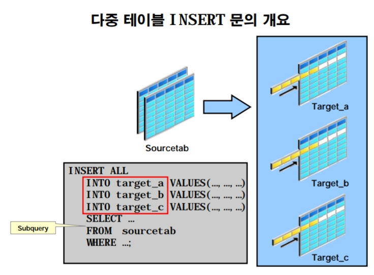 "다중 insert 문은 여러개의 테이블에 하나의 데이터를