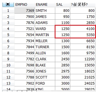 select empno, ename, sal, sum(sal) over(order by empno)누적치