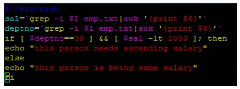 if [ $deptno -eq 30 -a $sal -lt 2000 ]; then