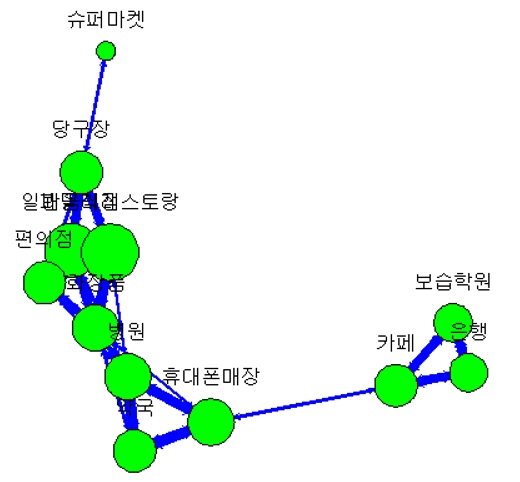 추출한 다음 단어들간의 연관관계를 출력하시오