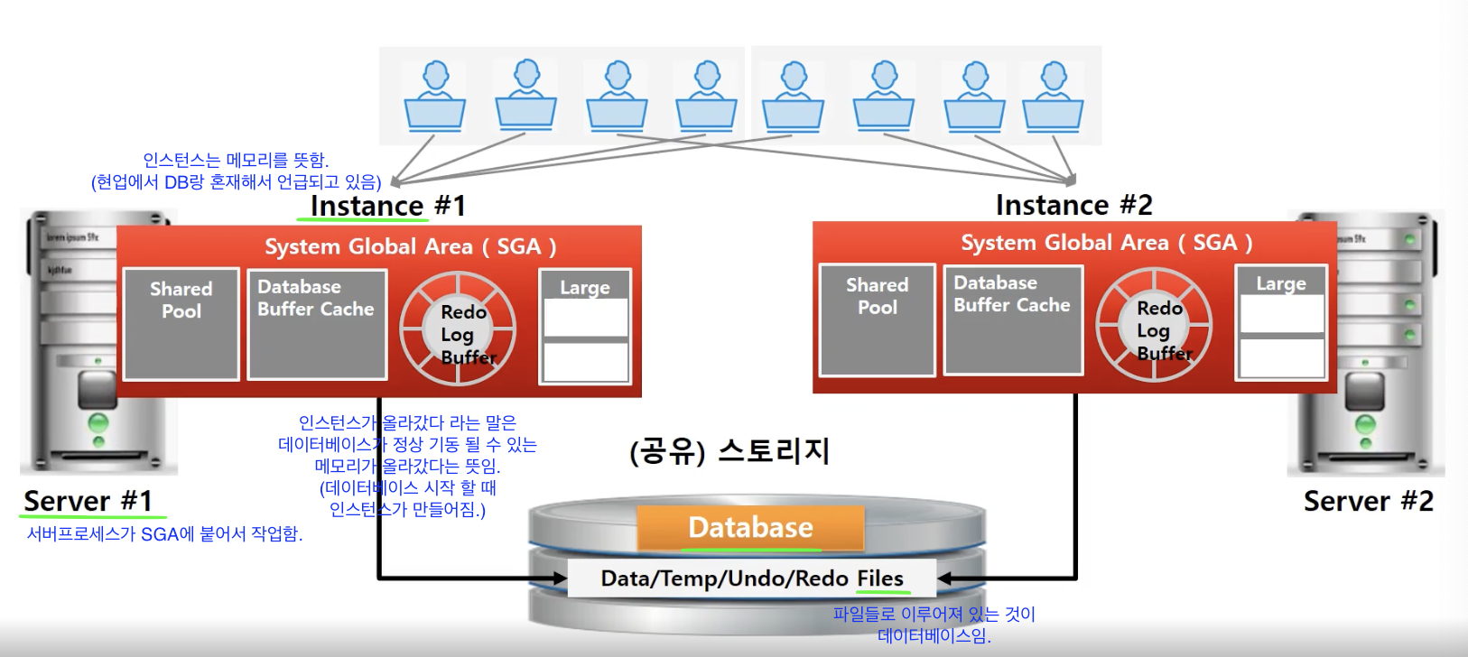 - RAC(Real Application Cluster): 1개 DB가 2개 이상의 Instance를 가지는 구조. 서비스가 멈추지 않도록 고가용성을 위한 방법.