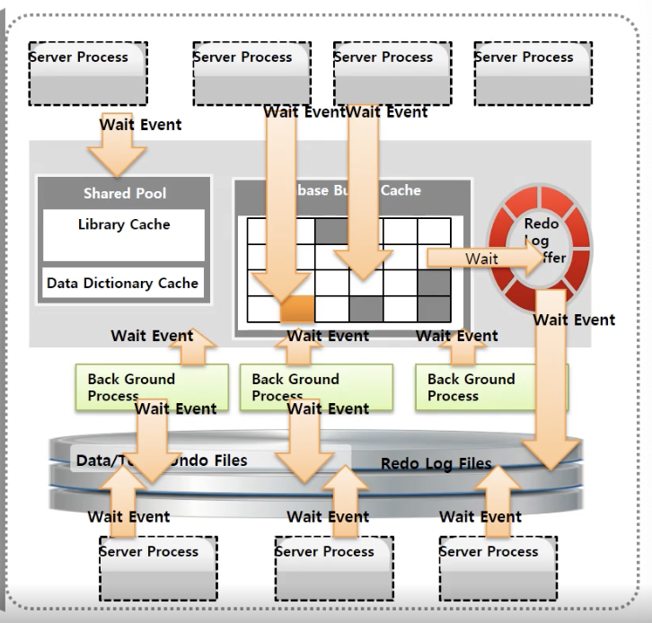 - 오라클은 서버 프로세스 또는 백그라운드 프로세스가 DB의 CPU, Memory, Database File, I/O 등의 모든 자원을 엑세스 하고 이용하는 세부 단계별로 상세한 Wait Event(대기 이벤트) 를 발생