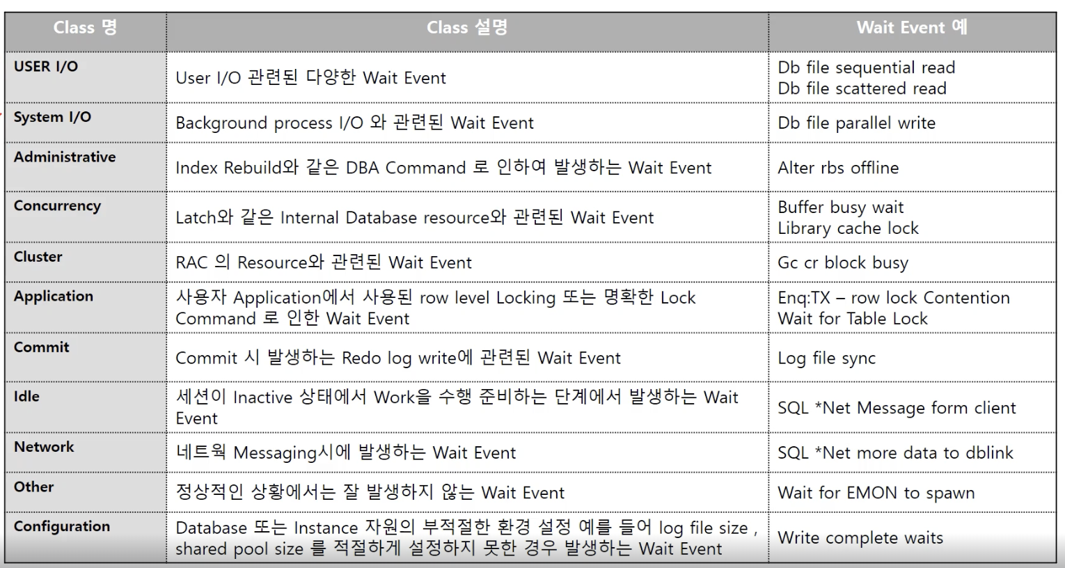 | Disk I/O | db file Sequential Read | Single block Access 시에 발생 (디스크에 Random I/O 수행 할 경우 발생) 일반적으로 OLTP 시스템에서 가장 많이 발생. |