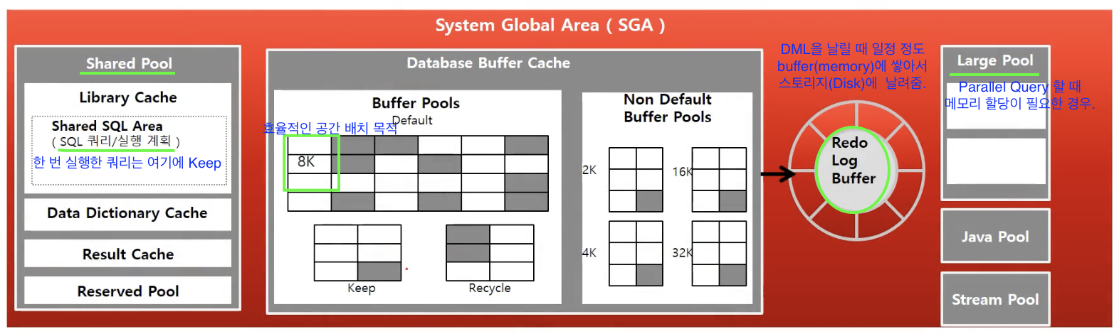 - Redo Log Buffer: 데이터 변경사항 (DML 발생 시) 정보를 가지며 Redo Log File에 Write 되기 이전에 Memory에 먼저 Write 되는 영역