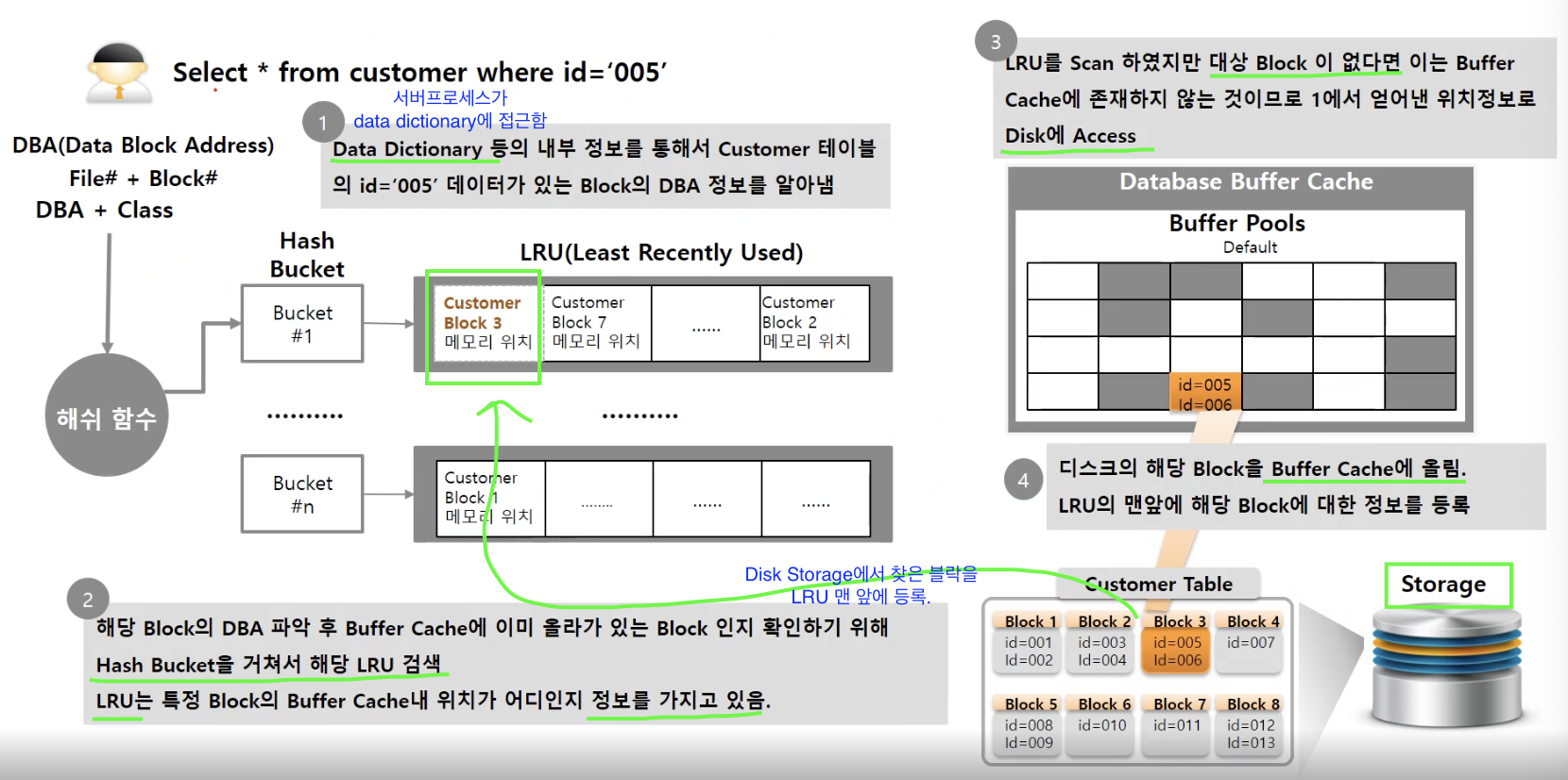 - 개별 데이터 Block은 File#과 Block#으로 구성되는 DBA(Data Block Access)로 표현 될 수 있으며, DBA는 Hash Bucket으로 쪼개져서 LRU 내에서 Buffer Cache의 위치 Address를 가지게 됨.