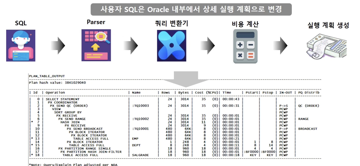 - 사용자 SQL은 Oracle 내부에서 상세 실행 계획으로 변경