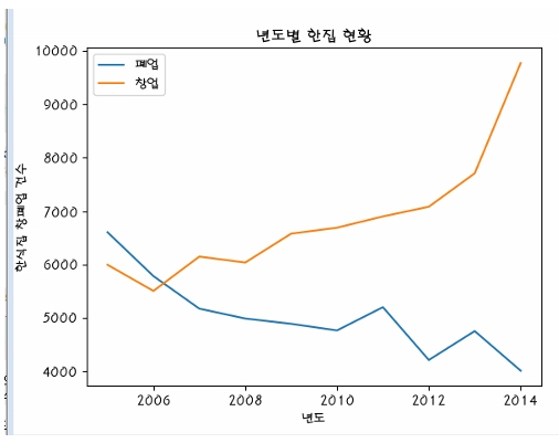 한식집의 창업과 폐업건수를 라인그래프로 시각화 하시오