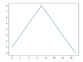 plt.plot([1,2,3,4,5,6,7,8,7,6,5,4,3,2,1,0])