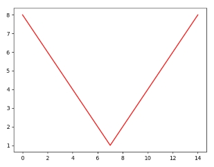 plt.plot([6,4,2,0,2,4,6],color='red')